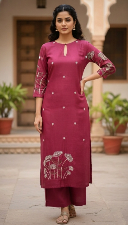 Introduce a touch of contemporary flair with this elegant Plum/Deep Magenta kurta set, crafted from comfortable and flowy cotton slub fabric.