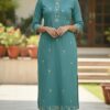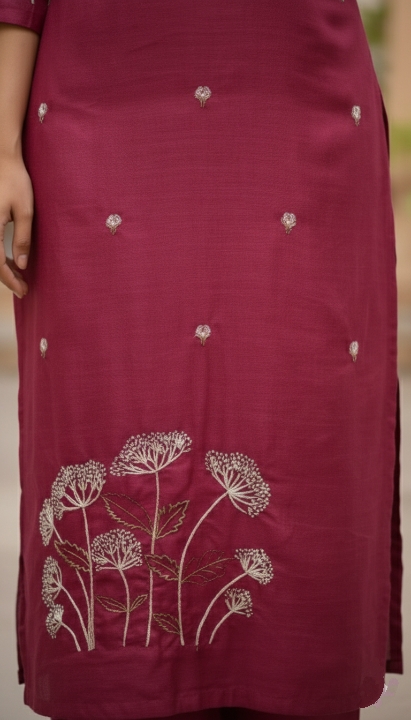 This straight kurta is adorned with beautiful hand embroidery in a modern floral/dandelion motif, prominently placed at the hem and artistically on the 3/4 sleeves.