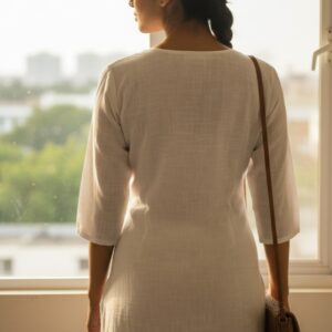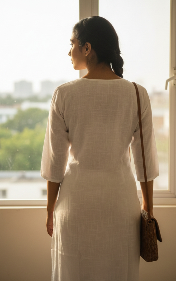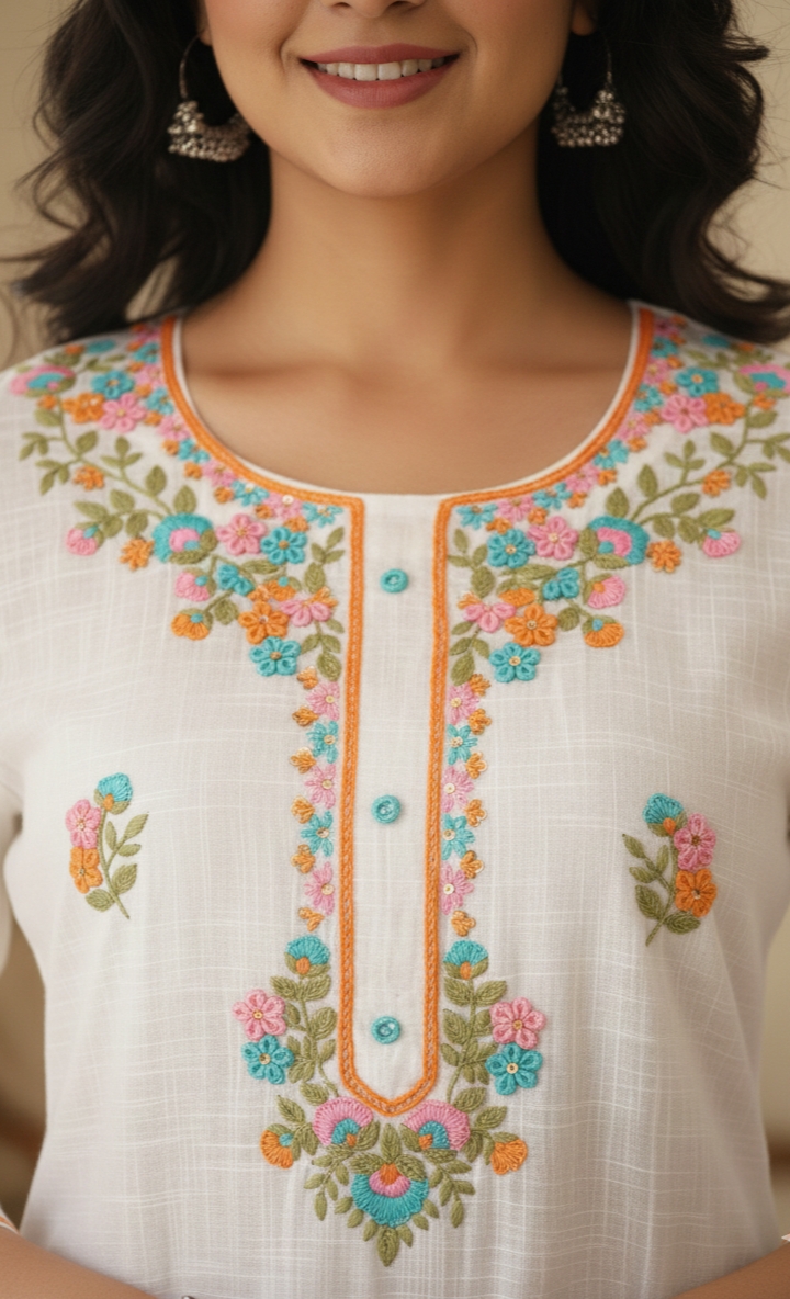 Elevate your wardrobe with this exquisite white cotton slub kurta set. Crafted from breathable, comfortable cotton slub fabric, this piece is beautifully adorned with intricate hand embroidery featuring vibrant floral motifs in shades of pink, blue, orange, and green.