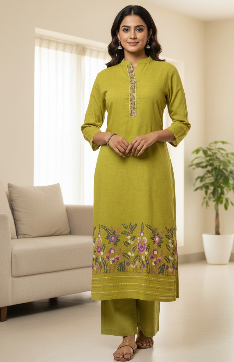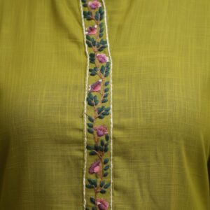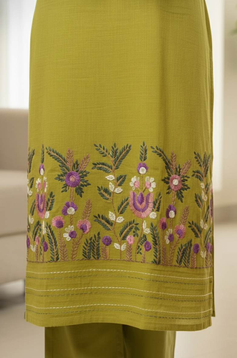 Embrace fresh elegance with this captivating lime green kurta set, made from soft and comfortable cotton slub fabric.The kurta’s hem is adorned with a lush, colorful floral border in rich shades of purple, lavender, and deep green.